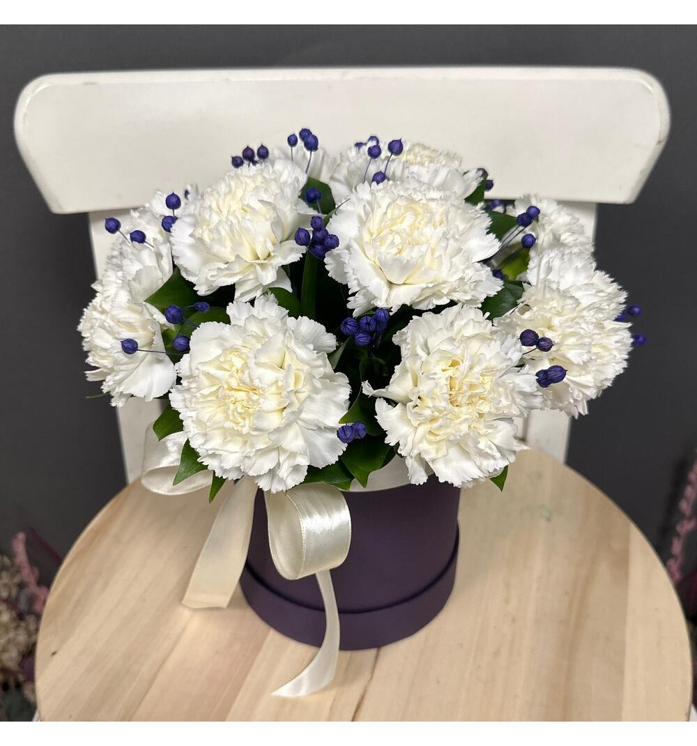 Белоснежные гвоздики в шляпной коробке - это изысканный букет, состоящий из нежных белоснежных гвоздик, которые символизируют чистоту, искренность и вечную любовь. Этот букет является прекрасным подарком для выражения своих чувств и создания особенной атмосферы. Шляпная коробка придает букету уникальный и стильный вид, делая его еще более привлекательным и роскошным. Этот композиция будет прекрасным украшением на любом торжественном мероприятии или просто прекрасным способом порадовать близких и дорогих людей.