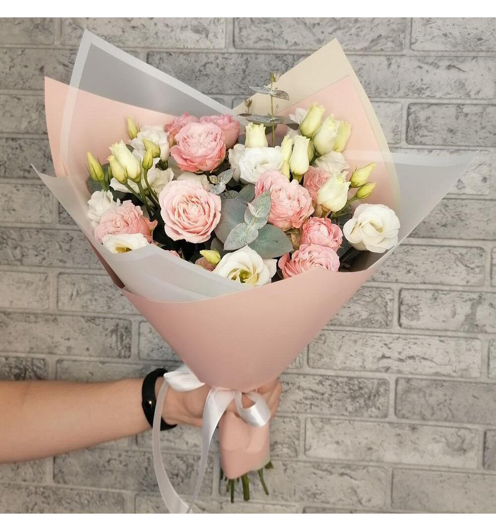 Букет "Каприз" - изысканная композиция, объединяющая спрей розы, лизиантусы, эвкалипт и каллы. Нежные спрей розы и лизиантусы придают букету роскошный вид и загадочность. Эвкалипт добавляет свежести и приятного аромата. Каллы в ассортименте приносят дополнительное очарование. Отличный выбор для особых моментов и знак внимания к близкому человеку.